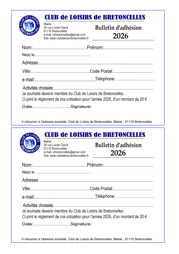 Pour adhérer facilement au CLUB de LOISIRS, nous vous invitons à télécharger et remplir le(s) bulletin d'adhésion individuel ci-joint, avec votre chèque de règlement (20 € par personne) pour l'année civile en cours, sous enveloppe,et la remettre à un animateur du Club ou dans la boîte aux lettres du CLUB qui se situe dans la cour de la Mairie, sous le préau.